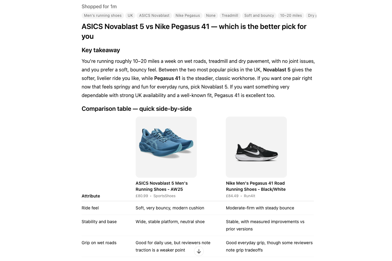 Ask “what’s the best winter jacket if I live in London and take the train into the city?” and Perplexity gets the context. It knows you deal with colder mornings, busy platforms and a damp commute, and it recommends products that fit those exact conditions.